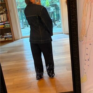 Chic dark denim jacket by Ganni. Features classic button-up design. Ideal for layering and casual wear. Yellow stitching, wide sleeves, very cute to be worn buttoned up or left open. In great condition. Size 42 - best for a large or x-large.