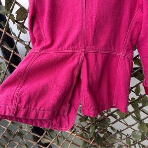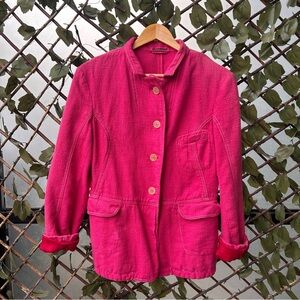 Jil Sander blazer, hot pink, see last photo for colour under indoor lighting, it’s not quite as vibrant as the outdoor pics but almost. Gorgeous colour. Great details, pockets in front & slit at back, contrast stitching, sleeves are lined, body isn’t. Nice heavy cotton linen blend.