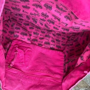 Sparkly accents with gold. Inside pockets. Cotton & polyester mix. Thick quality! No rips or tears. Bold fuchsia tote with gold emblem. Features Juicy Couture branding. Needs a light interior washing. Perfect for everyday use.