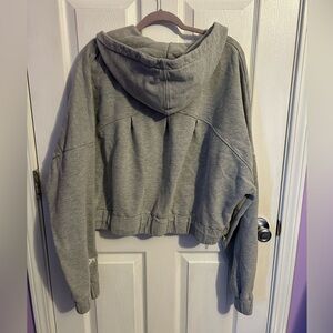 Half Zip Warm Up Hoodie from Popflex. Size XL. Color is a light heathered grey. Has zippered pockets, hoodie drawstring, and toggle drawstring waist to wear long or cropped.