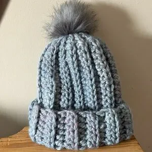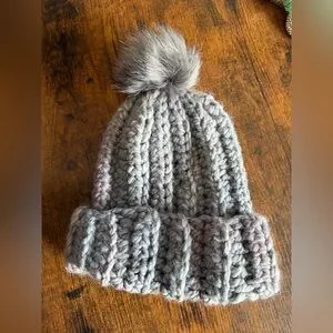 Keep yourself warm with this cozy gray handmade crochet chunky wool blend beanie. Has hinds of pink / purple color. Wool and acrylic blend. Featuring a playful pom-pom, it's perfect for chilly days. Pom is removable. Adult size. New.