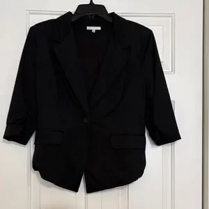 Chic black blazer with a tailored fit. Features a single button closure and three-quarter sleeves. Ideal for professional or casual wear.
