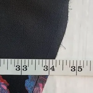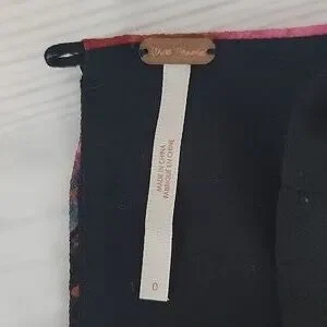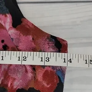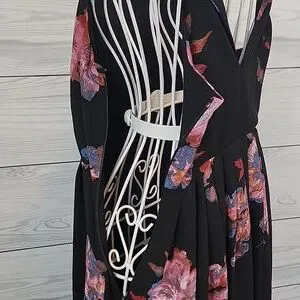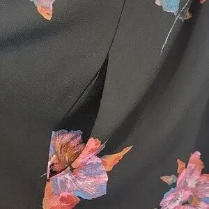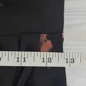 Floral print mini dress by Free People featuring a black base with pink and blue flowers. Flirty in its fit & flare silhouette with round neckline, keyhole back with button closure, and a pleated skirt with a scalloped hemline. Great pre-owned condition.
