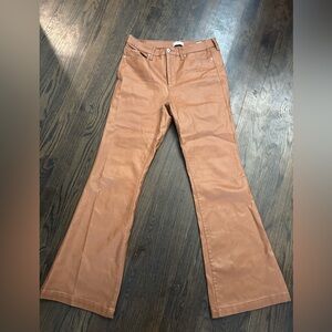 Chic flare jeans with a wide leg design. Warm tan color for versatile styling. Perfect for casual or dressy looks.