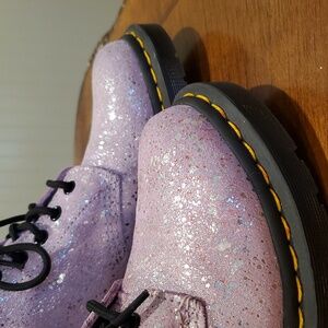Sparkly Pascal boots by Dr Martens. Soft, flexible leather. Pastel pinkish lavender with metallic silver spots. Like new condition, near perfect. One of the boots has some tiny pink dots that look like part of the pattern, but they're only on one boot so I assume they're a flaw. Otherwise boots are perfect.