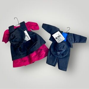 NWT Classic Amish Doll Clothes. Three piece mini Red & black dress with black bonnet. Four piece mini outfit with blue shirt, black overalls, jacket and hat. Both outfits hanging from mini hangers. Absolutely adorable set. Possibly vintage items. Please see details and measurements in photos!