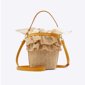 Stylish woven design with ruffle detail. Features yellow leather trim. Perfect for a tropical vacation.