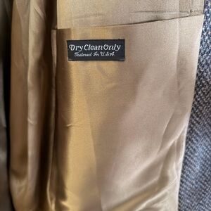 Classic trench coat with a herringbone pattern. Features a belted waist and button closure, has slit in the back.