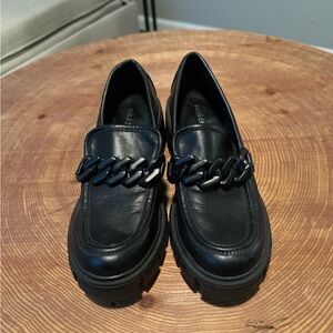 Elegant black loafers with a bold chain accent, 1.5 inch heel. Size 6