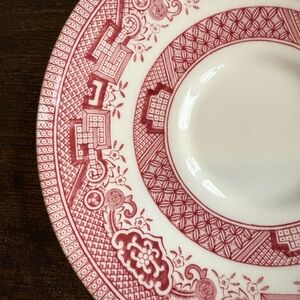 Key details include how discontinued pink willow pattern, microwave and dishwasher safe.