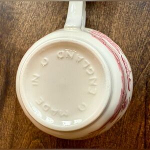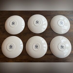 In great preloved condition without chips or cracks. One saucer has a small area of fading, visible in detail photo. Glazing process has expected small clumps on glaze on bottom of saucers from production.