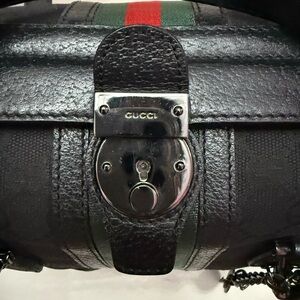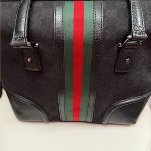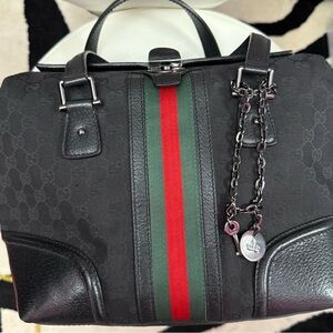 Stylish Gucci satchel in black. Features iconic red and green stripe. Excellent condition. See slightest sign of wear in pic OMG one corner. This bag in all black with hematite key and tag is rare to find in this condition. No lowball offers or trade offers will be accepted. I will not email or sell on a different platform. Thank you for understanding. 12x10x4”