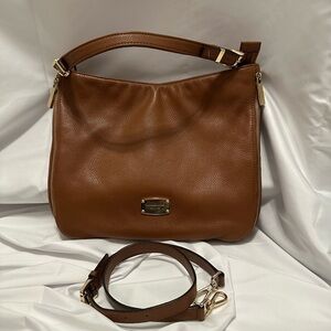 Chic tan leather shoulder bag by Michael Kors. Features adjustable strap and gold-tone accents. Ideal for versatile styling.