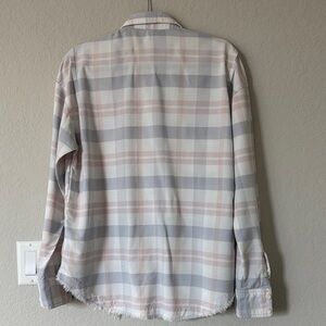 Chic plaid shirt with button-up front. Features dual chest pockets. Soft pastel tones.
