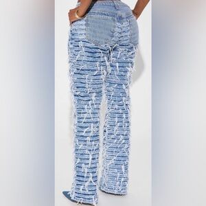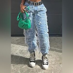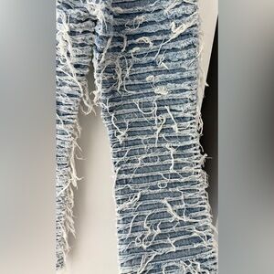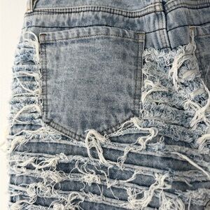 Chic shredded denim with a bold texture. Perfect for a trendy look.