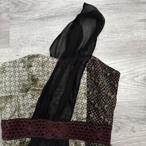 Unleash your inner goddess with this Free People one-shoulder maxi dress, a breathtaking fusion of ethereal design and bohemian charm. The dress cascades with a captivating mix of geometric and floral prints, enhanced by sheer chiffon panels that create a mesmerizing flow with every movement. A braided belt cinches the waist, accentuating your silhouette with a touch of artisanal detail, while the unique hooded detail adds an element of mystique. Imagine yourself twirling at a music festival, enjoying a leisurely seaside vacation, or making a dramatic entrance at a bohemian-chic wedding.