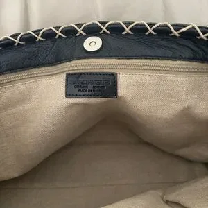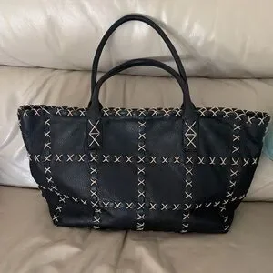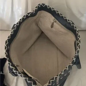 Elegant black leather tote bag featuring intricate stitch detailing. Linen lining with magnetic close. Wonderful large interior zip pockets . Perfect for everyday use with a stylish touch. Genuine leather , Made in Italy