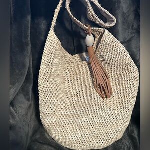 Chic and versatile woven shoulder bag. Features a stylish tassel accent. Perfect for everyday use.