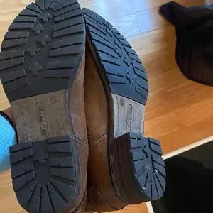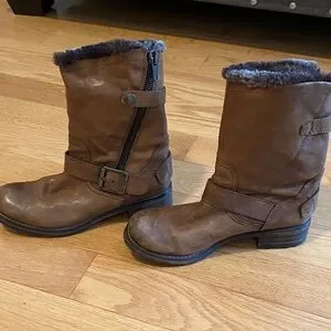 Rugged brown leather boots by Clarks. Durable sole for all-day comfort. Zips on the side with snap closure. Very soft fur like interior. Very good condition.