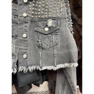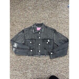 Cropped Distressed Black Jean Silver Studded Jean Jacket Long Sleeve size Medium