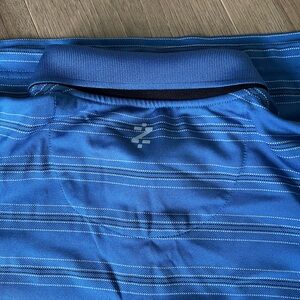 Featuring a vibrant blue/purple hue with subtle stripes, this shirt is crafted from a smooth, moisture-wicking fabric ideal for athletic or casual wear.