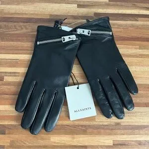 AllSaints Black Leather Gloves with Asymmetric Zipper