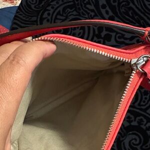 Stylish Coach crossbody in coral. Features front zip pocket and adjustable strap. Perfect for daily wear.