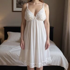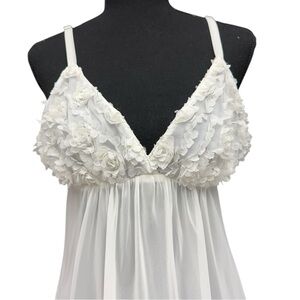 Vintage Oscar de la Renta babydoll slip dress in a soft ivory white sheer chiffon. Features delicate floral appliqué cups, a plunging V neckline, adjustable straps, and a floaty empire-waist silhouette. Romantic and ethereal with bridal-inspired styling