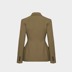 This is a fully lined single-breasted blazer with a notched lapel and an hourglass silhouette. It’s made with (Re)ssential — softly structured stretch fabric that holds its form while you move easy. This fabric is sourced from a premier Portuguese mill and made with 54% recycled polyester and 26% LENZING™ ECOVERO™ Viscose.