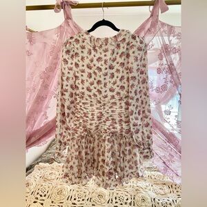 “Embrace your inner flower child with the Jayleen pink mini dress, designed to take you through the early days of spring and into late summer. This ruffle mini dress features an ultra-feminine pansy burnout print, cascading ruffle details, and a handkerchief hem skirt.”