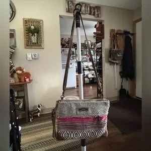 Stylish crossbody bag by Myra Bag. Features pink and brown patterns. Perfect for everyday use.