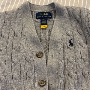 Charming gray cable knit sweater by Polo Ralph Lauren. Features button closure and front pockets. Ideal for layering.
