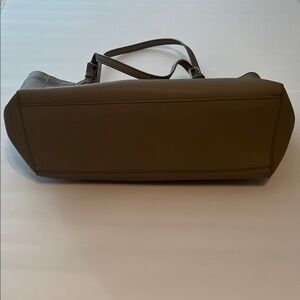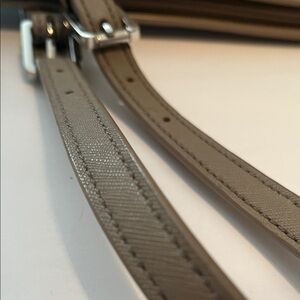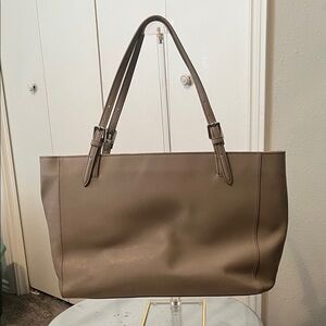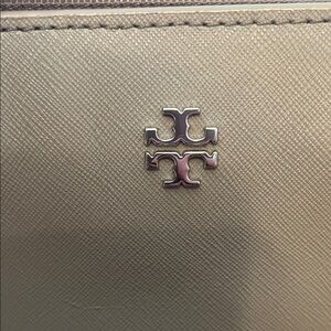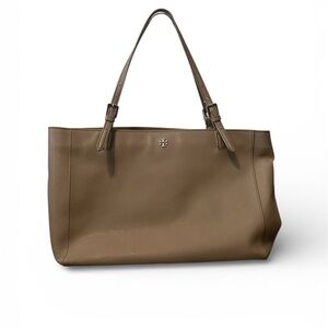 Tory Burch York Buckle tote in tan/gray Saffiano leather. Sleek design with iconic logo. Great size to carry a lot. Inside is in good condition with minimal markings. Has two open pockets (for a phone, lipstick, keys, etc), the middle of the inside has a full size padded pocket that closes with a full length zipper. Would be a great spot to hold something a little more fragile like a small laptop or tablet. The back of the inside has more open pockets and a zippered pocket. Lots of room!