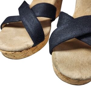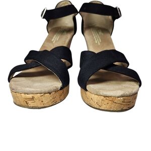 TOMS Women's Clarissa Black Canvas Cork Wedge Sandals Size 7.5 Ankle Strap Heels