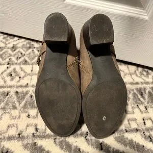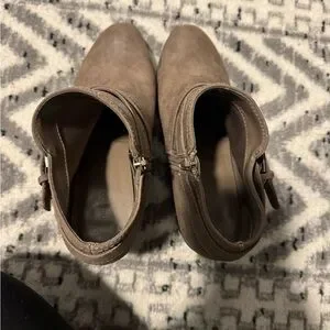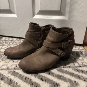 Stylish taupe booties with buckle detail. Perfect for versatile wear.