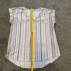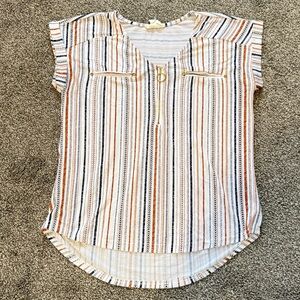 Flower & Feather women's white blue and burnt orange striped short sleeve shirt with a 1/4 zip neckline and two decorative chest zippers