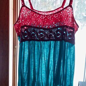Be bold and wear this lace tank over your favorite cute bra. A great pick for a night out on the town. This easy breezy top is a fun look for summer. Throw on a statement making necklace, your favorite sunnies, and a cute pair of sandals, and you are ready to go from beach bum to street style star. I bought this top in a Vegas Boutique. Wore once and stored it. Rich & vibrant turquoise & pinks with eyelet and crochet details. It is a large but I would say more of a small but room for your chest area. Perfect to slip on after coming out of the water. Non-smoking home.