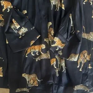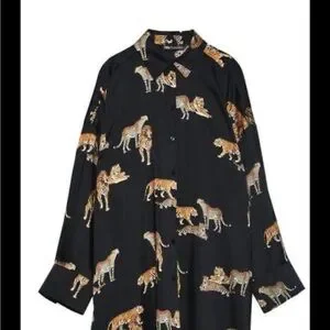 Satin like material shirt dress. Button closure. Some wear on buttons (see pics) but otherwise good condition!