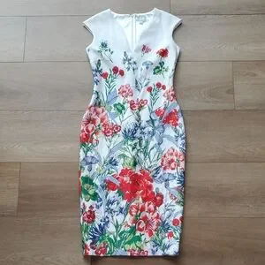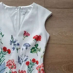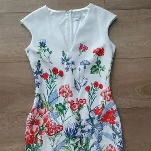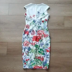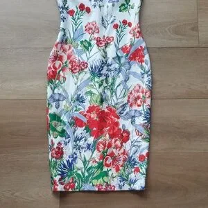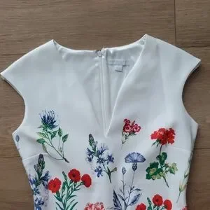 gorgeous floral dress, like new condition. zipper in back of dress and slit at back of knee with stiching still connected (see pic)