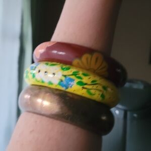 Add a touch of elegance with this floral and metallic bangle set. Featuring vibrant yellow and classic gold tones, these accessories are perfect for any occasion.