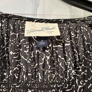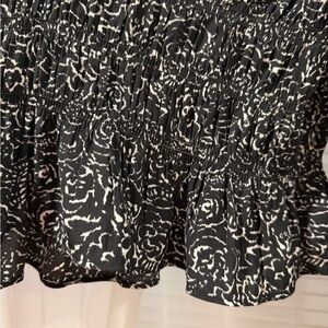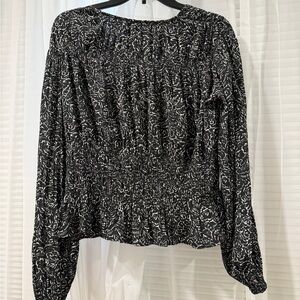 Chic black and white blouse with intricate pattern. Flattering fit and versatile style.