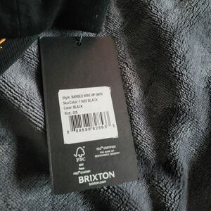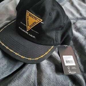 Black cap featuring yellow embroidered details. Brixton logo on front. Stylish and modern design.