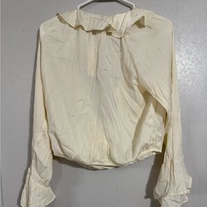 This elegant cream blouse features a stylish ruffle design, perfect for any occasion. Its soft fabric ensures comfort and a flattering fit.
