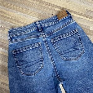 AMERICAN EAGLE Strigid Mom Jeans size women’s 00! Destroyed knees! 9 1/2 inch rise and 28 inch inseam! Stretchy jean material! Very comfortable! Only worn a few times! No signs of wear! Excellent condition! Bundle and save!