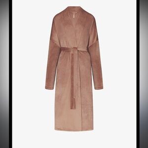 Luxurious SKIMS velour robe in a rich honey beige hue. Ideal for cozy lounging.