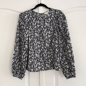 Sold out H&M Navy and white blouse in feminine floral patterned cotton weave with a round neckline and an keyhole cutout opening with a button at the back of the neck. Long, voluminous balloon sleeves with narrow elastication at the cuffs