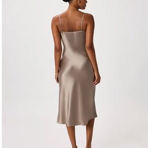 Luxurious 100% silk slip dress by Quince. Ideal for elegant evenings or relaxed nights. Sophisticated taupe hue.