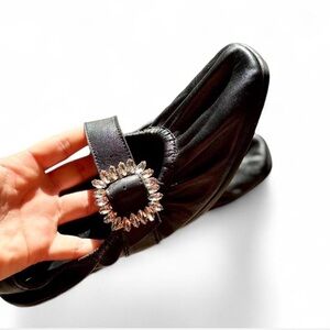 Black leather ballet flats featuring a Mary Jane strap with rhinestone buckle detail. Soft leather construction with a flexible sole and classic rounded toe.