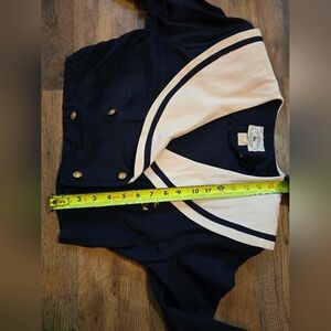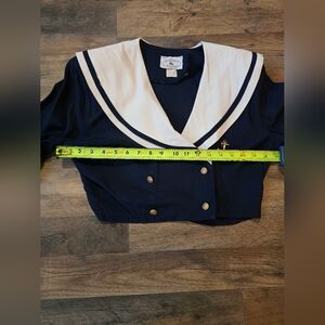 Jonathan Martin Vintage 80's Women's Navy Blue & White Cropped Sailor Blouse Size 7/8. One minor marks on front (shown in pictures) and faded size tag. No other visible flaws. Measurements in photos