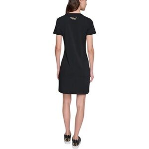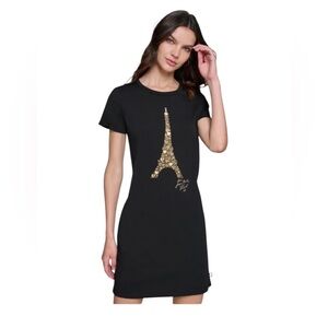 Chic Karl Lagerfeld Paris t-shirt dress featuring the iconic Eiffel Tower graphic embellished in gold-tone detailing. This effortless mini dress has a classic crew neckline, short sleeves, and a flattering straight silhouette that’s perfect for everyday wear or styled up with boots or sneakers.